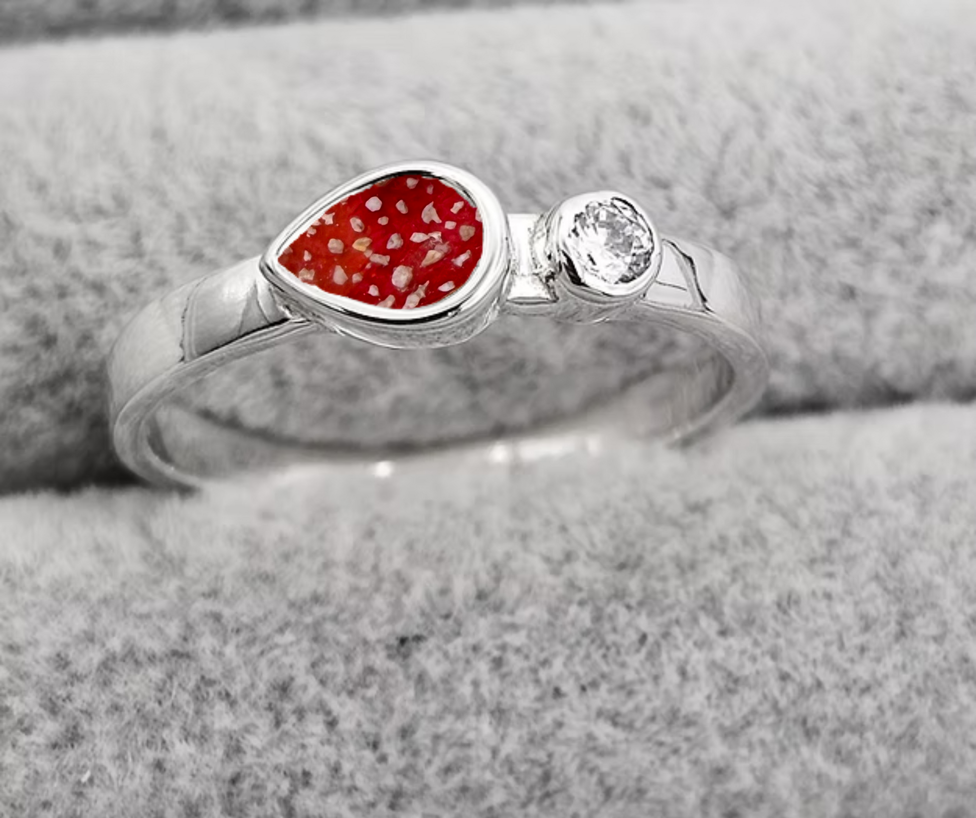The Roseen ring features a large pear shaped inclusions area finished with a medium thickness band and a solitaire CZ stone.